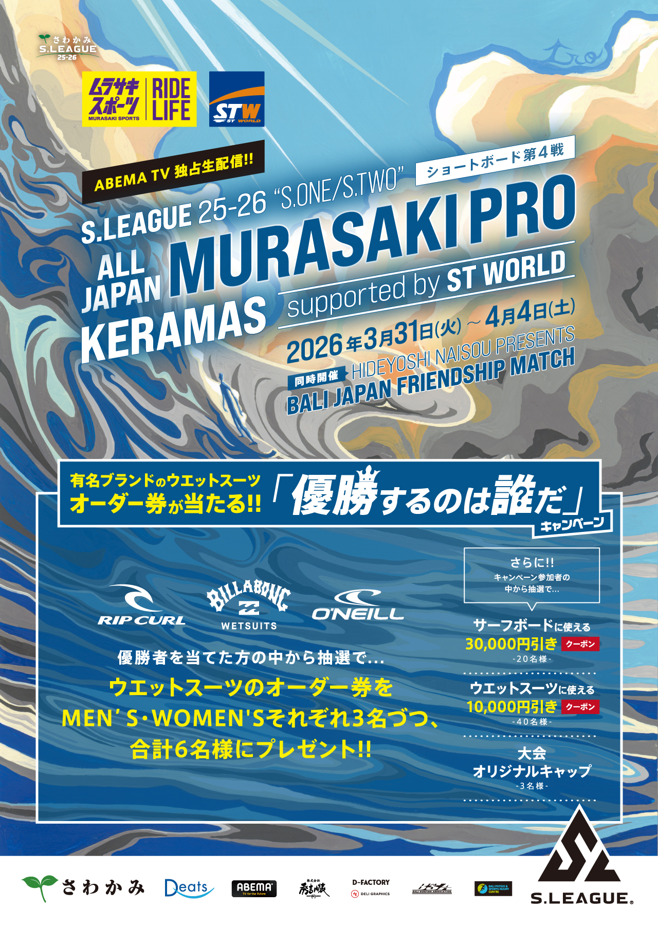 FEATURE 特集 FASHION SURF SNOW SKATE OTHER 件 サーフボード ウェットスーツ サーフィングッズ キャンペーン 【終了】プロサーファーと一緒にサーフィンができる!SURFING FIRST CHALLENGE!! 2025/07/28 総額100万円以上!優勝者を当ててウェットスーツをGET!!|優勝するのは誰だ!?キャンペーン 2026/03/17 22 1 2